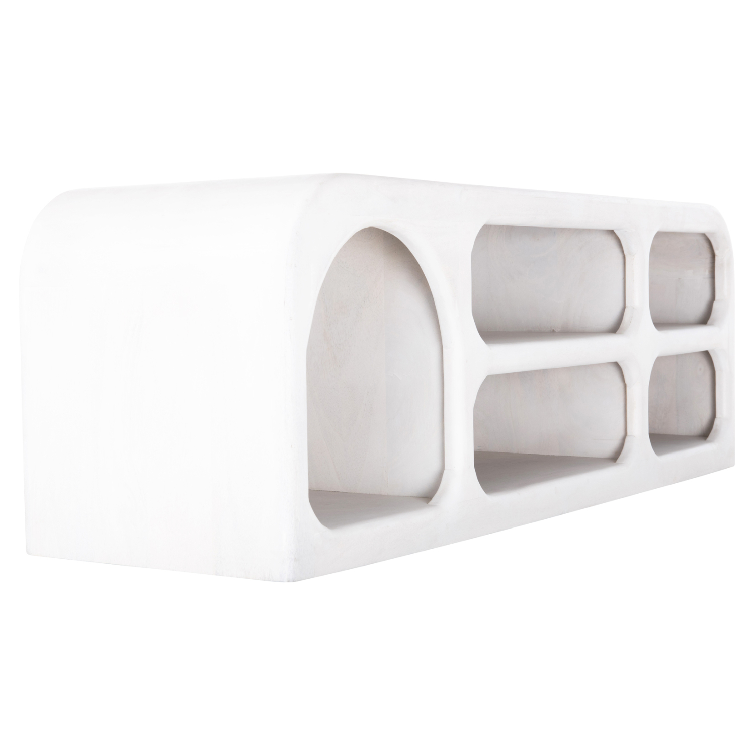 Το έπιπλο τηλεόρασης HANDYR είναι εξολοκλήρου κατασκευασμένο από μασίφ ξύλο mango σε ΛΕΥΚΟ χρώμα. Οι γωνίες και οι άκρες είναι στρογγυλεμένες ενώ διαθέτει 5 ανοιχτούς χώρους αποθήκευσης ή τοποθέτησης αντικειμένων. Το μήκος της επιφάνειάς του είναι ικανοποιητικό και χωράει τις περισσότερες τηλεοράσεις, εάν αποφασίσετε να την τοποθετήσετε στην βάση της και όχι στον τοίχο.