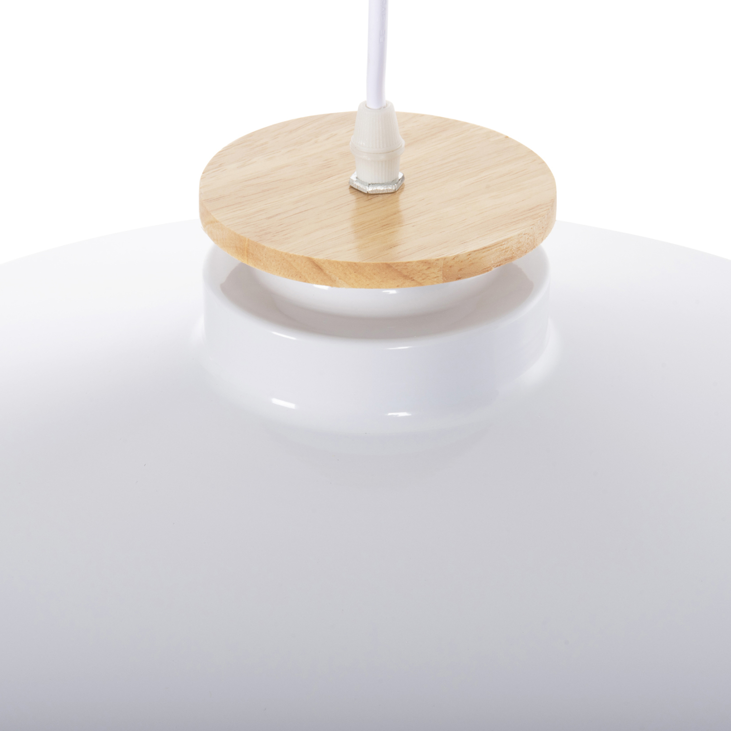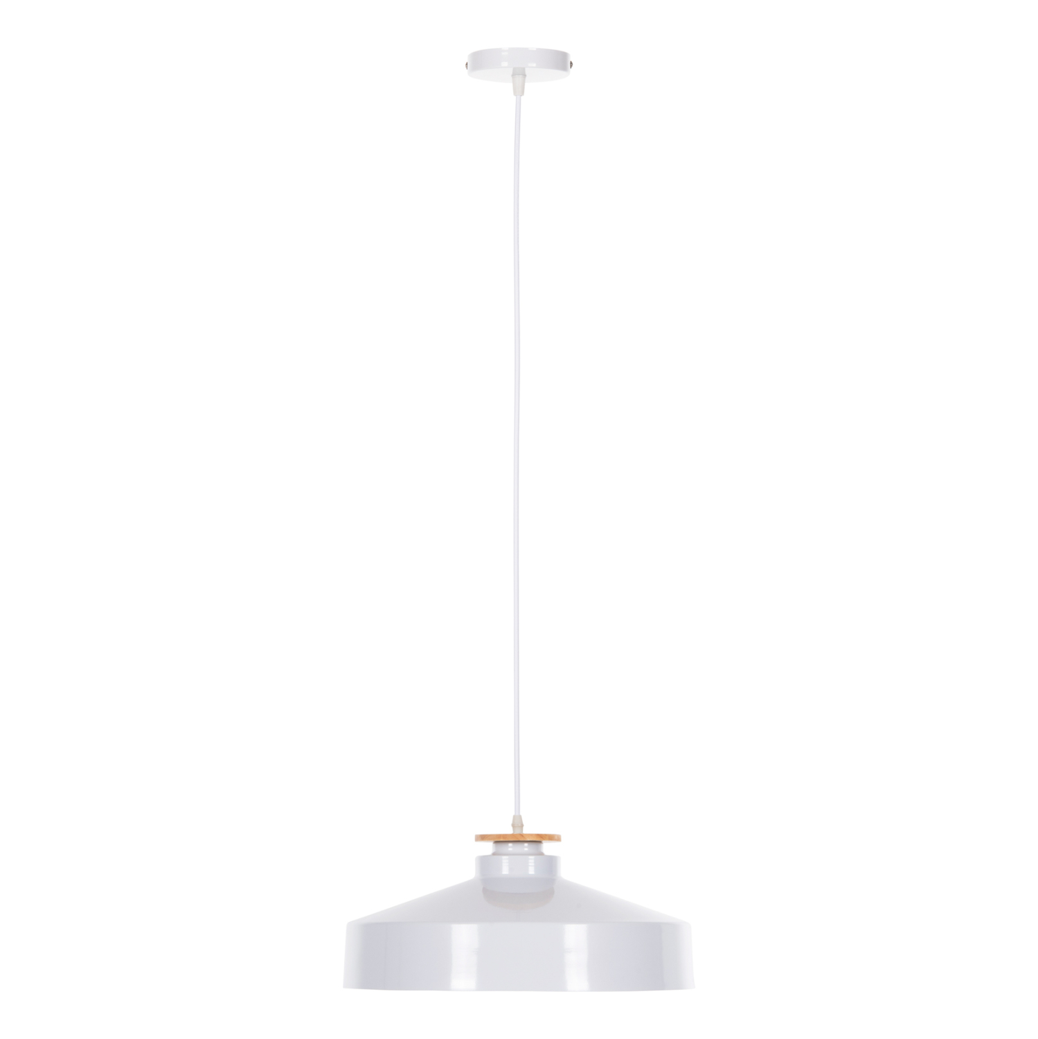 Ανακαλύψτε αυτό το νέο μας κρεμαστό φωτιστικό οροφής και ολοκληρώστε την διακόσμησή σας. Πρόκειται για ένα φωτιστικό με ΛΕΥΚΟ ρηχό μεταλλικό καπέλο σε σχήμα καμπάνας με λεπτομέρεια ξύλου στην κορυφή του φωτιστικού. Αισθητικά, ολοκληρώνεται με το λευκό καλώδιο κρέμασης και την λευκή βάση οροφής, και αποτελεί την τελευταία τάση στα φωτιστικά οροφής.