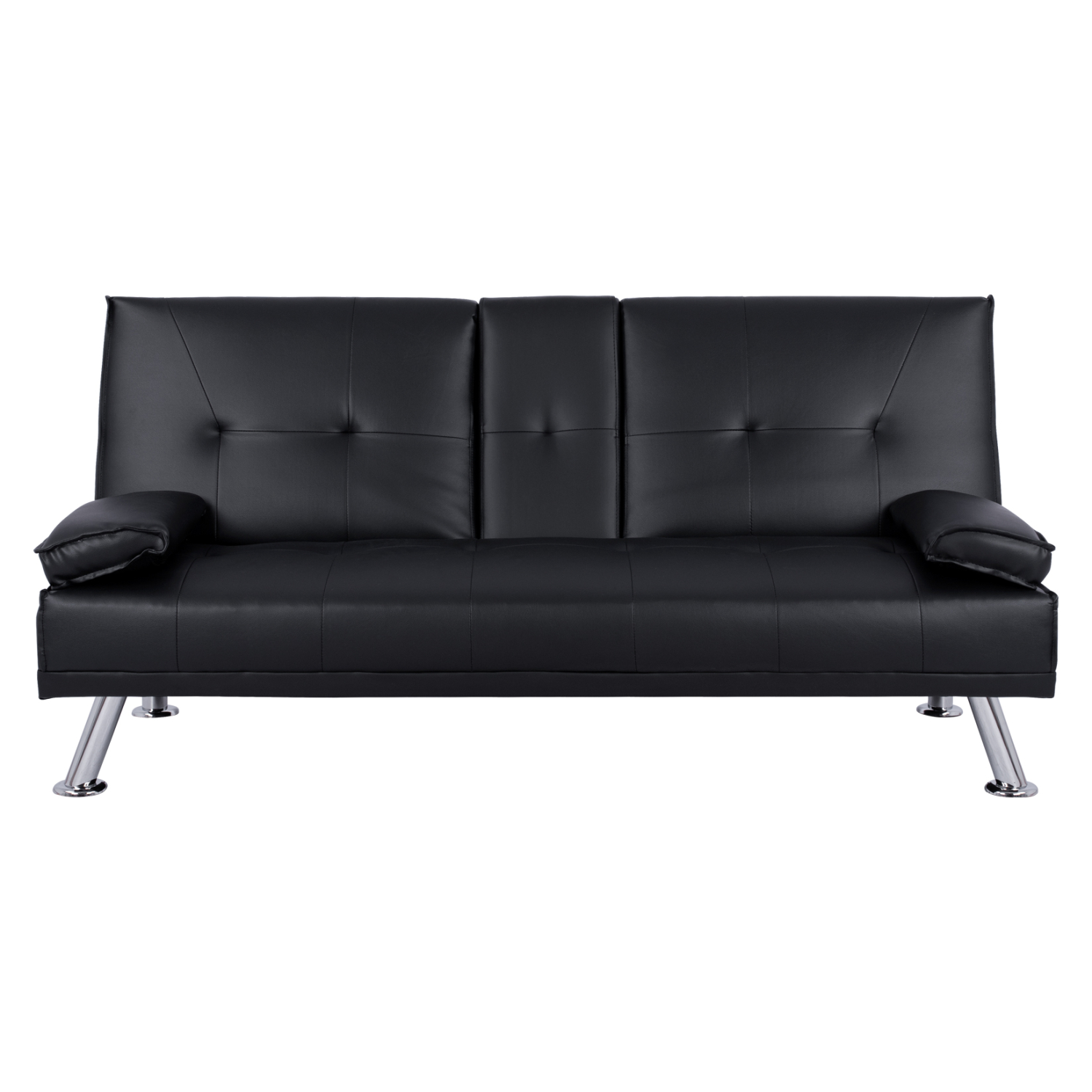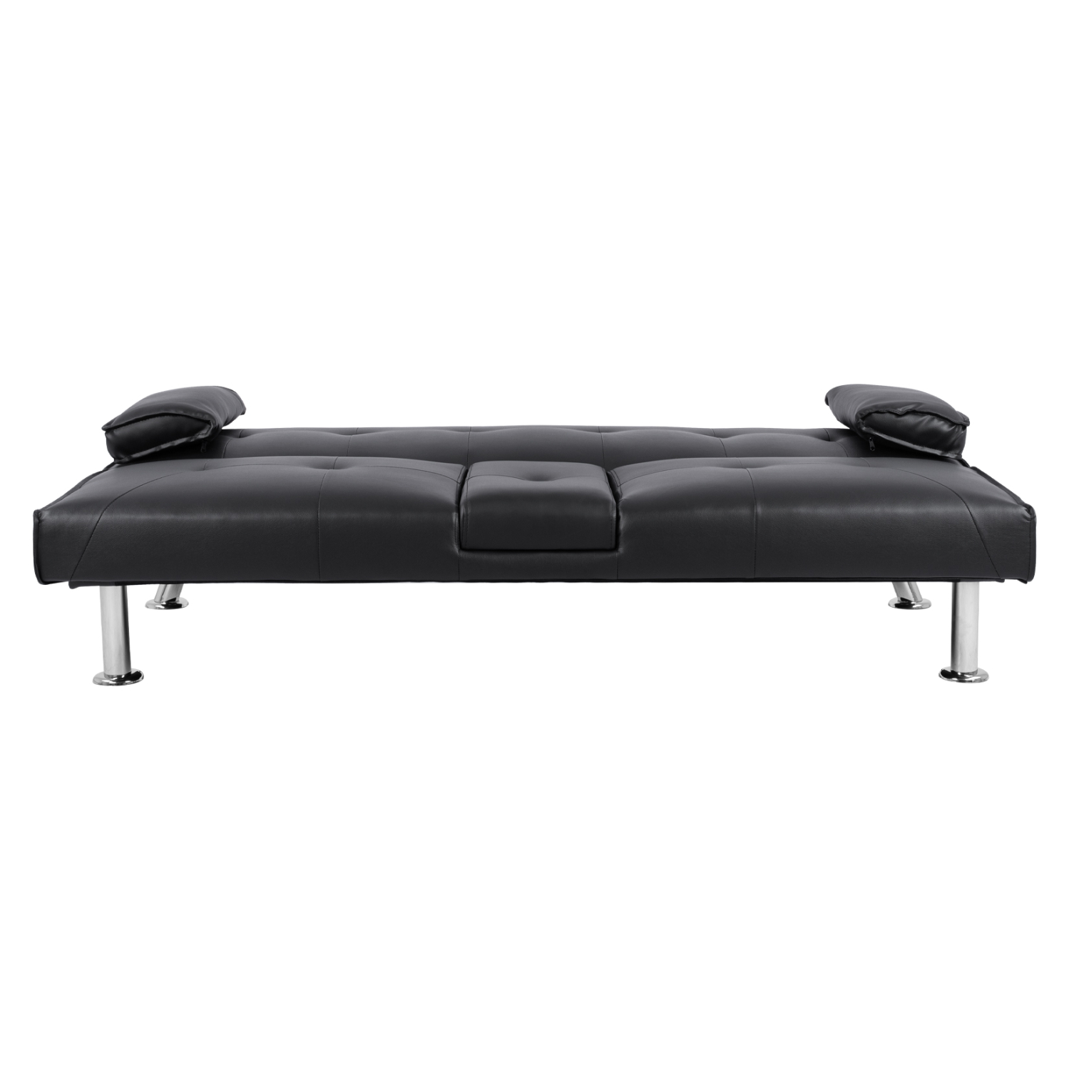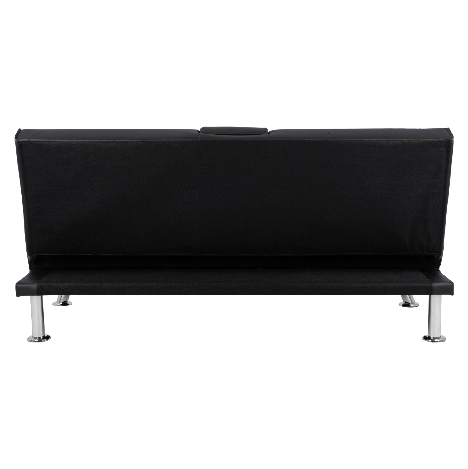Μοντέρνος καναπές – κρεβάτι επενδυμένος με μαύρο pu και μεταλλικά πόδια, με πτυσσόμενο μπράτσο στο κέντρο του, με ειδικές θήκες για την τοποθέτηση ποτηριών.