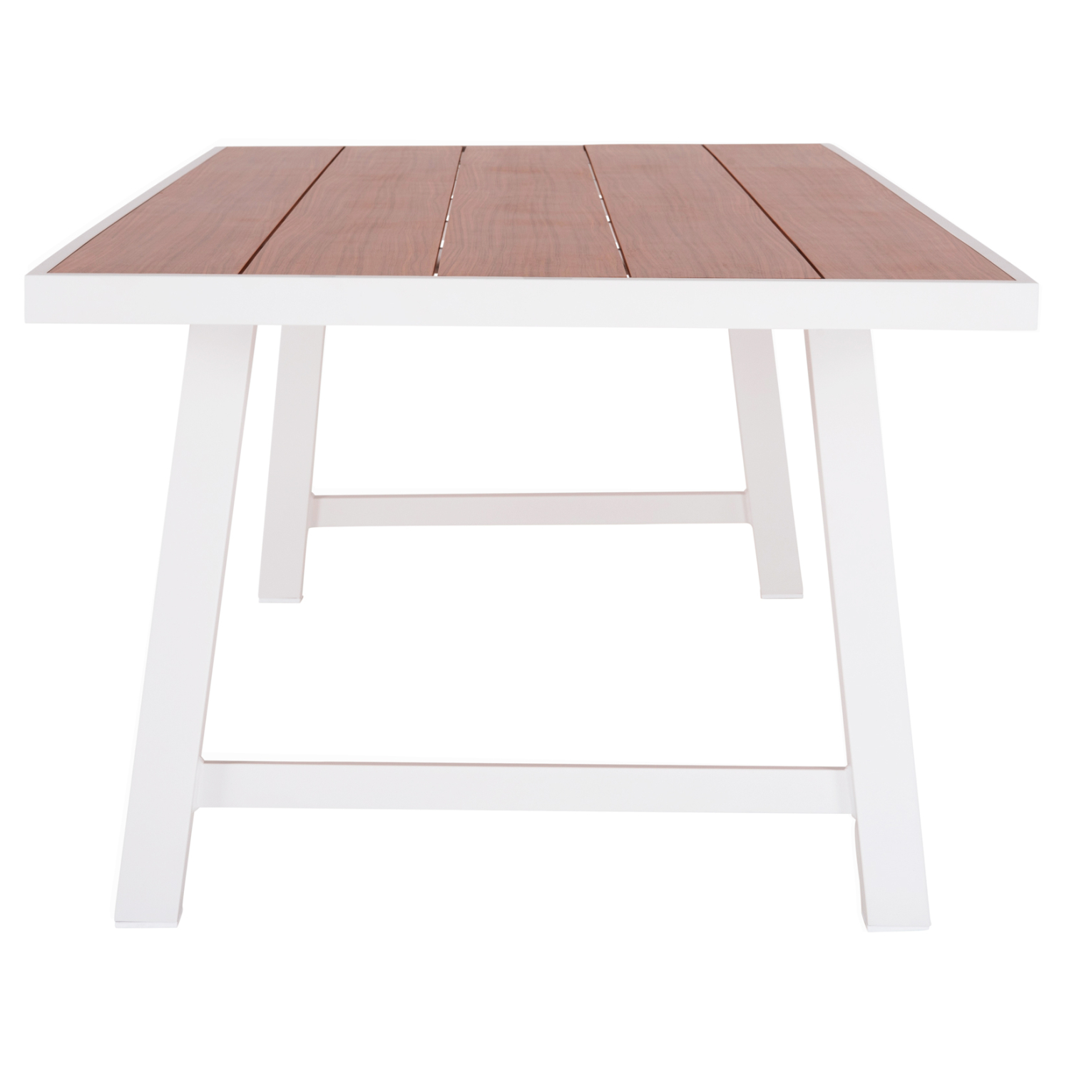 Το GOBAR είναι ένα μεγάλο ορθογώνιο τραπέζι για εξωτερικούς χώρους με σκελετό αλουμινίου σε ΛΕΥΚΟ χρώμα. Η επιφάνεια είναι επίσης από slats (φέτες) αλουμινίου σε χρώμα απομίμησης ξύλου. Πρόκειται για ένα τραπέζι που μπορεί να εξυπηρετήσει 8 τουλάχιστον άτομα, φιλοξενώντας τις πιο όμορφες στιγμές της ζωής σας.
