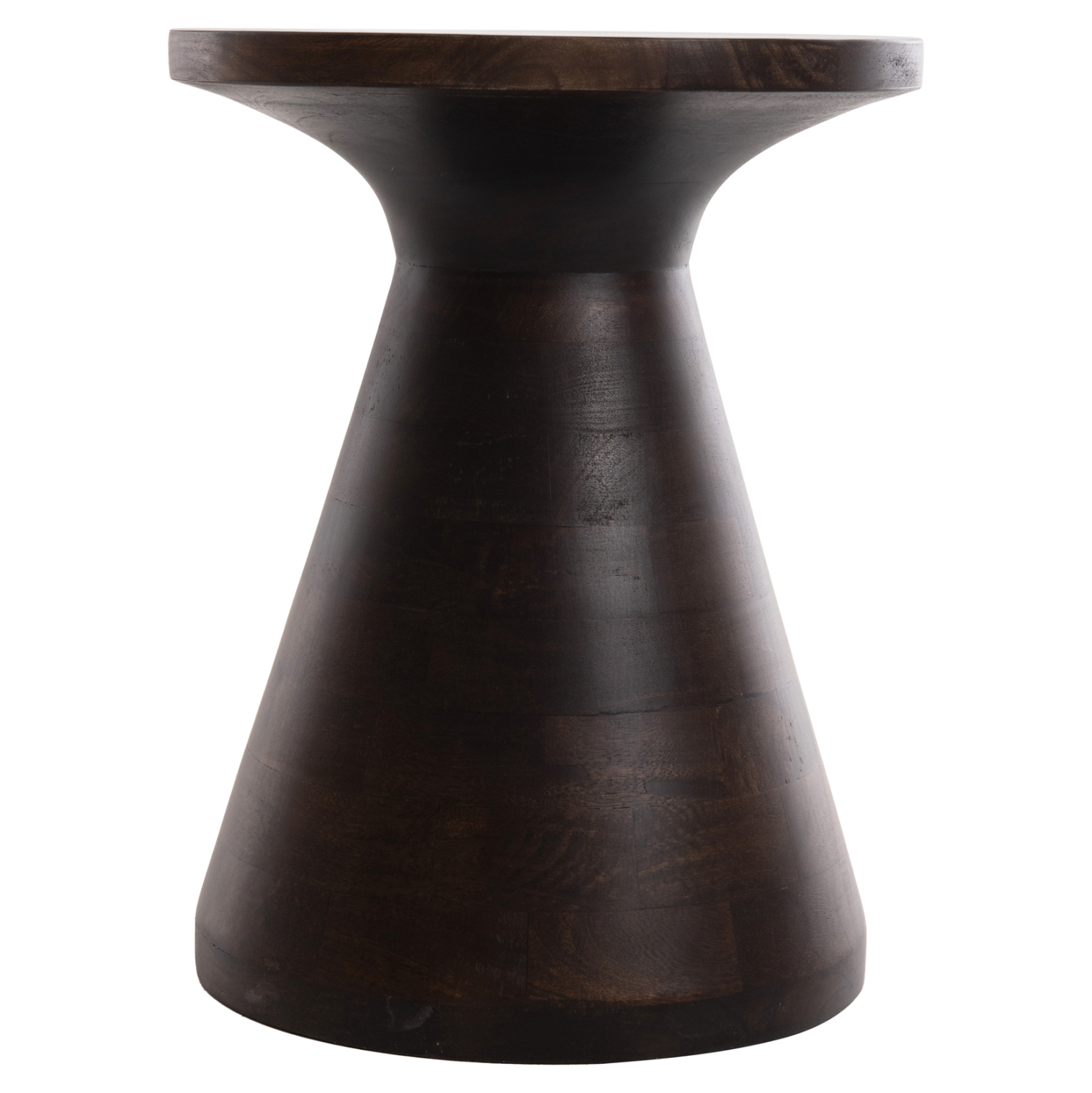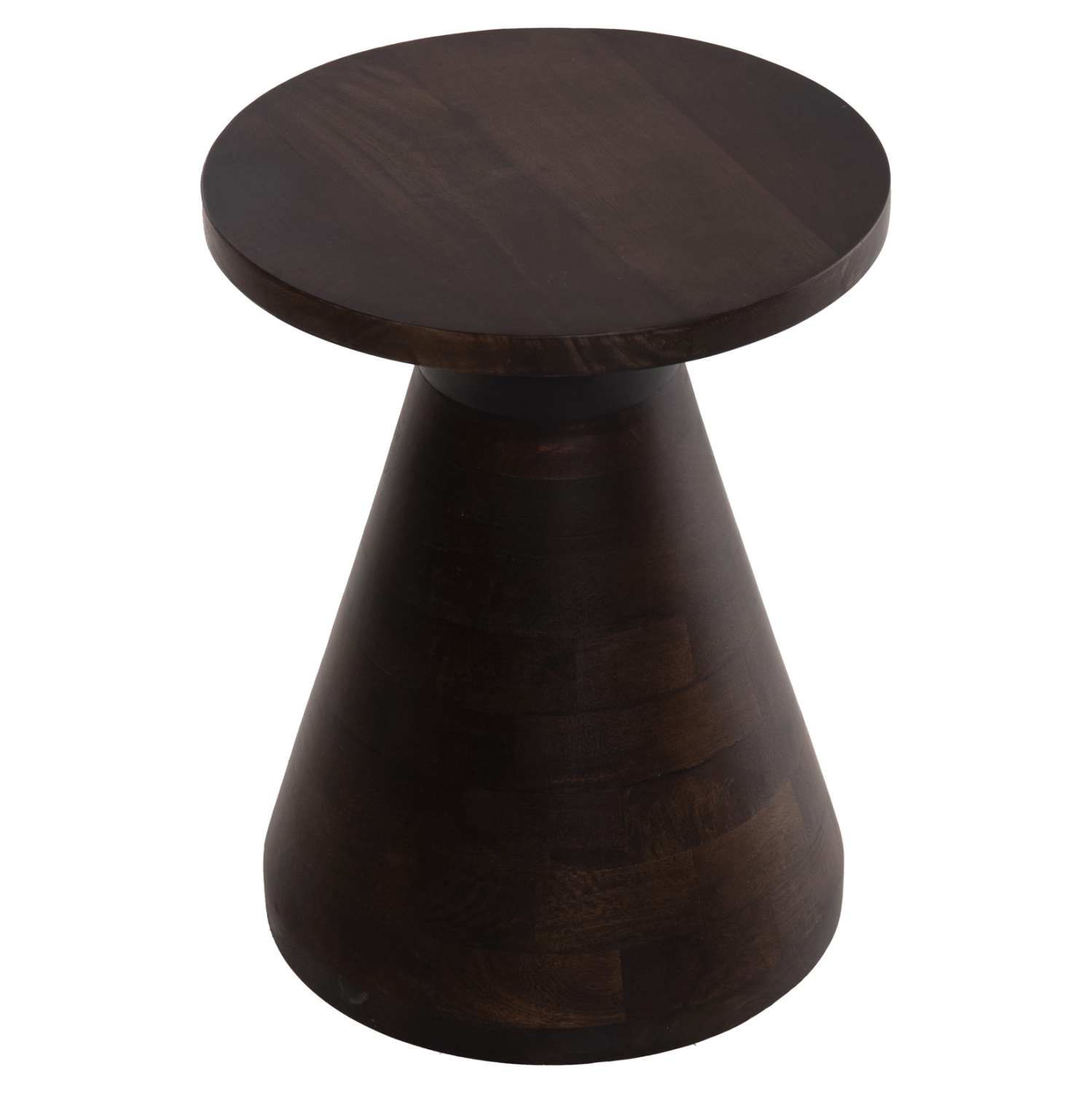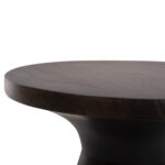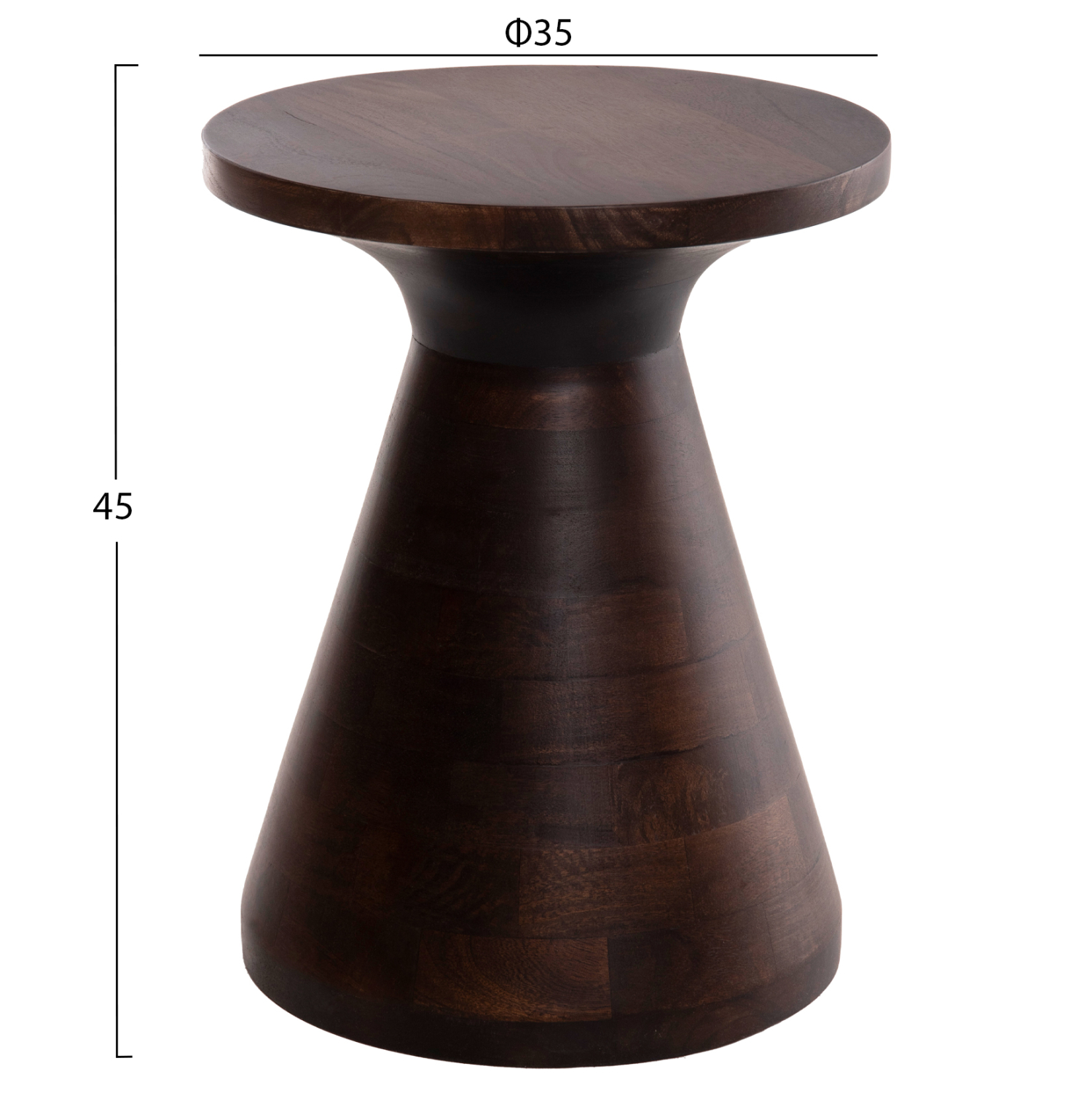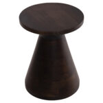 Το στρογγυλό τραπέζι σαλονιού FOSS που είναι εξολοκλήρου κατασκευασμένο από μασίφ ξύλο mango σε ΣΚΟΥΡΟ ΚΑΦΕ χρώμα μοιάζει με σκαμπό, χάρη στο κωνικό σχήμα της βάσης που καταλήγει στην στρογγυλή επιφάνεια. Ένα τραπέζι που θα εντυπωσιάσει με το σχήμα και το χρώμα του.